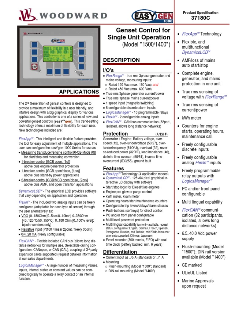 Powerful genset controls (easygen). Real and reactive power sensing. Advanced can communication provides control of most common engine ecu’s and allows connection to: Woodward ikd 1 module for expansion of the onboard i/o set.